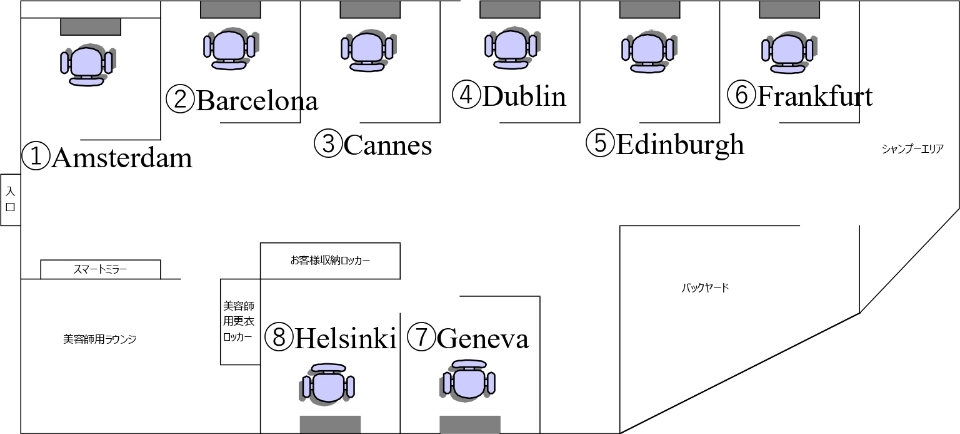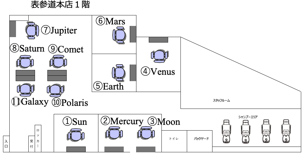 Omotesando落ち着いたプライベート感が漂うサロンです。左手に6面のカットブース、右手に2面のカットブースとお客様用ロッカー、美容師専用ラウンジ、奥に3台の夢シャンを配置。