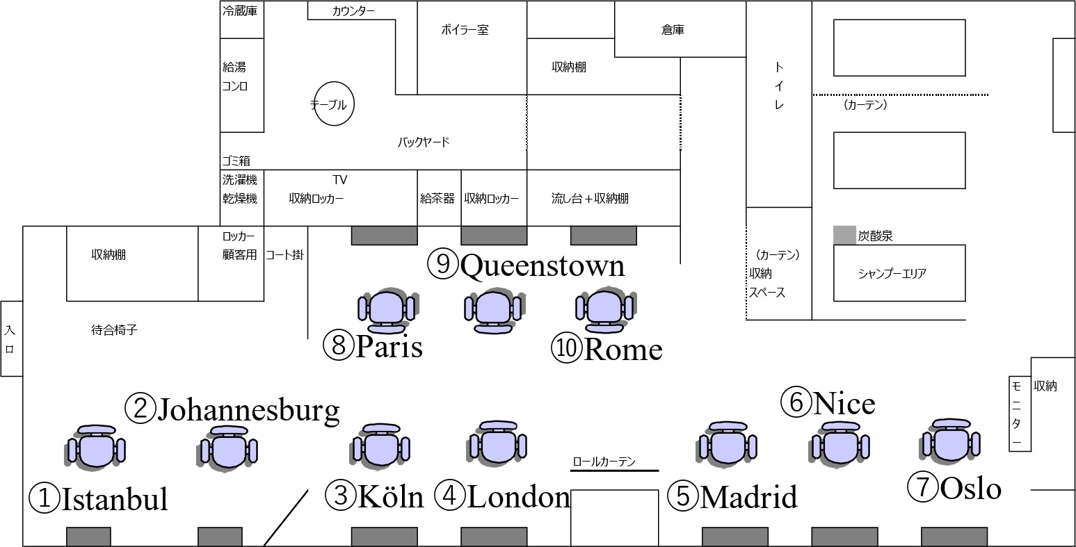 フルフラットのシャンプー台を3台ご用意。いずれも最新の夢シャンです。また炭酸泉もご利用いただけます。